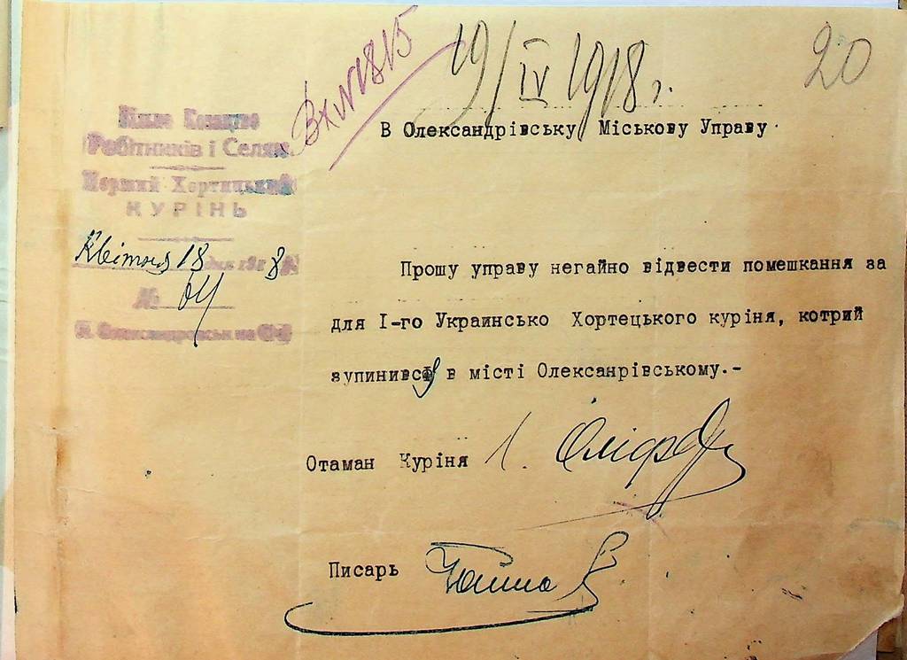 Лист Олександрівського повітового коменданта до Олександрівської Міської Управи щодо забезпечення потреб I Хортицького Куреня вільного козацтва |