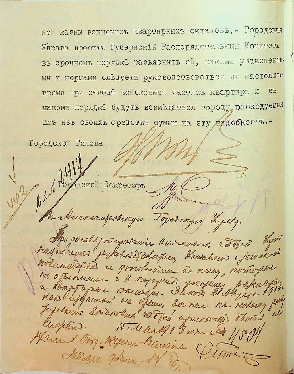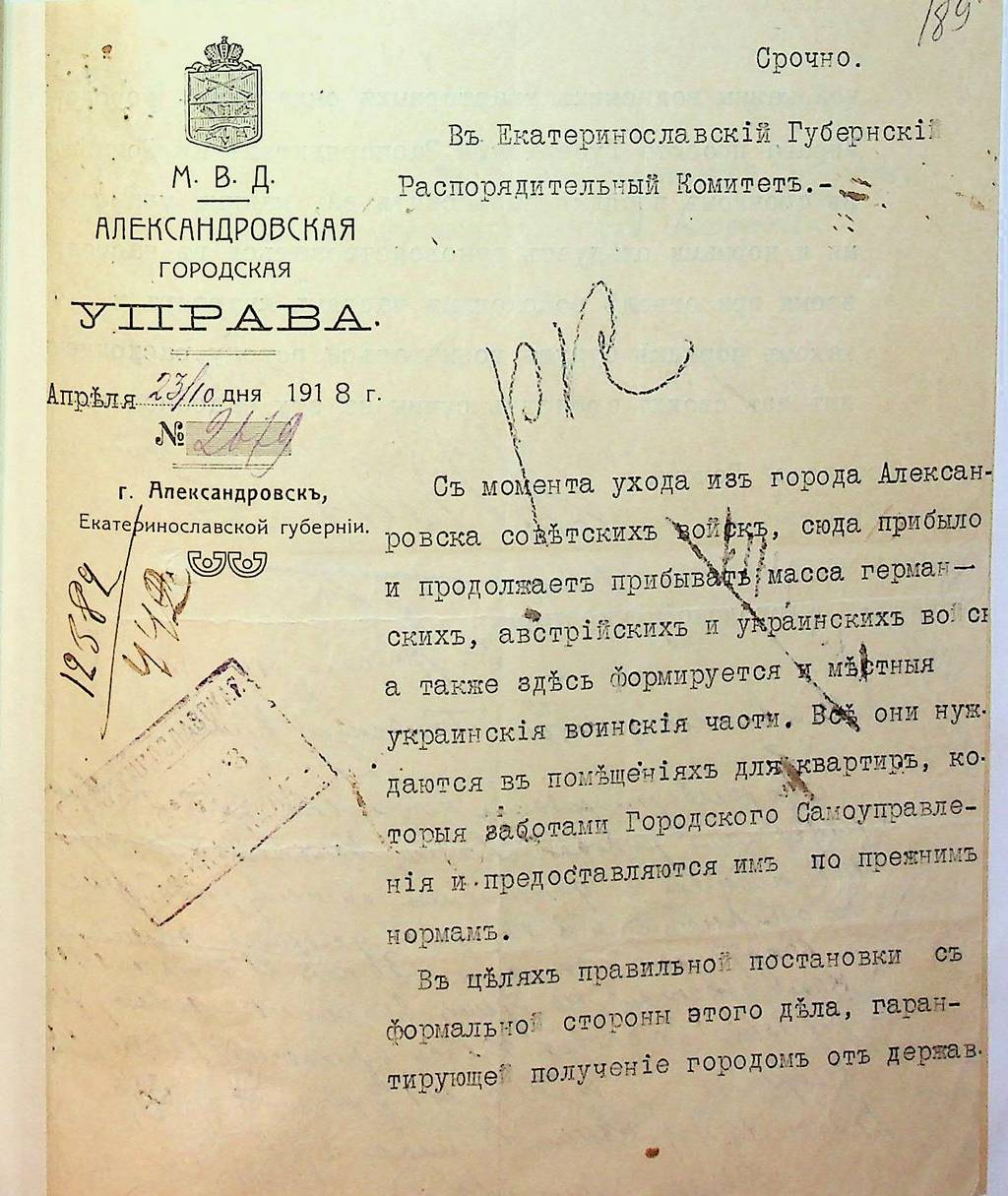 Прохання Олександрівської Міської Управи до Катеринославського Губернського Розпорядчого комітету надати роз’яснення про розміщення військових частин |