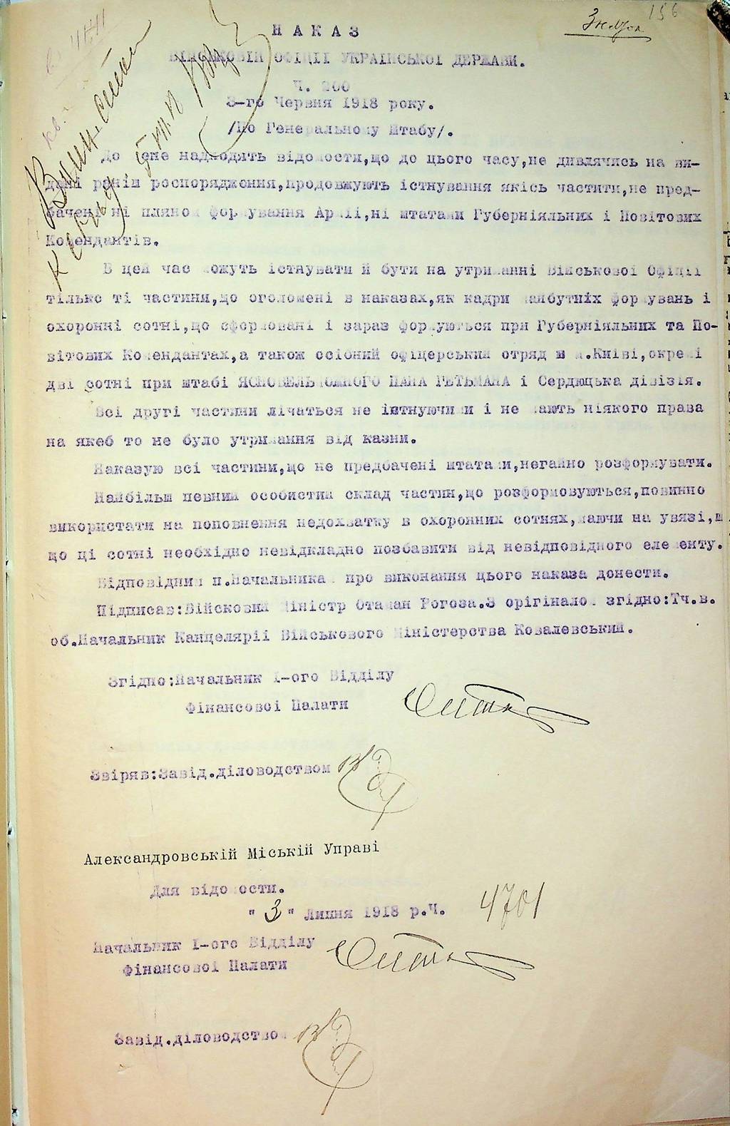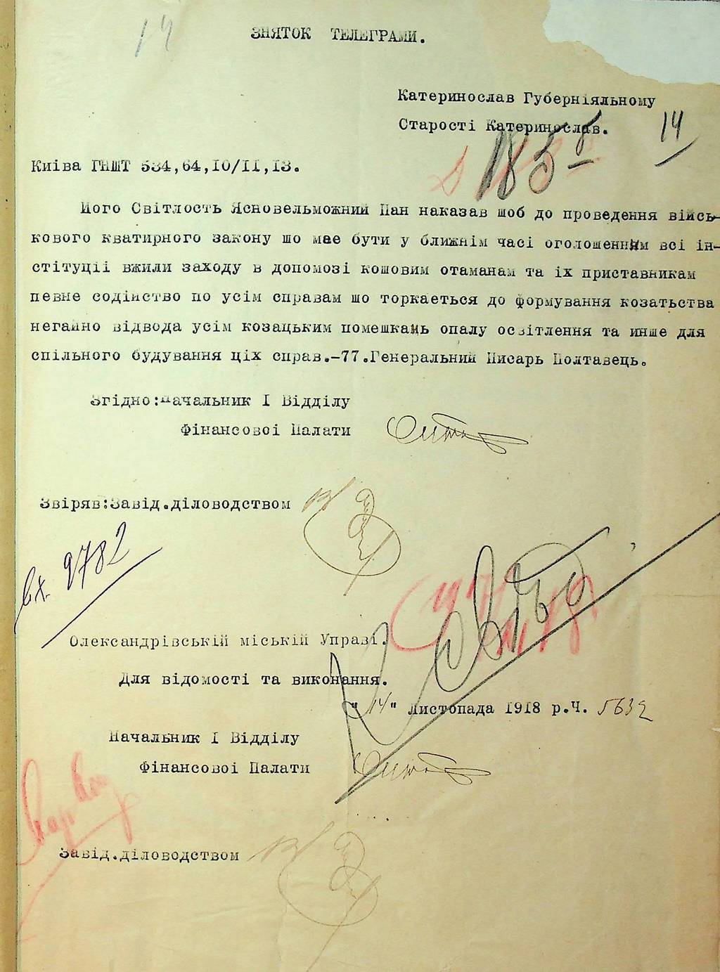 Зняток телеграми до Катеринославського Губерніяльного Старости про наказ Гетьмана Скоропадського про вживання заходів в допомозі кошовим отаманам та їх представникам в формуванні козацтва |