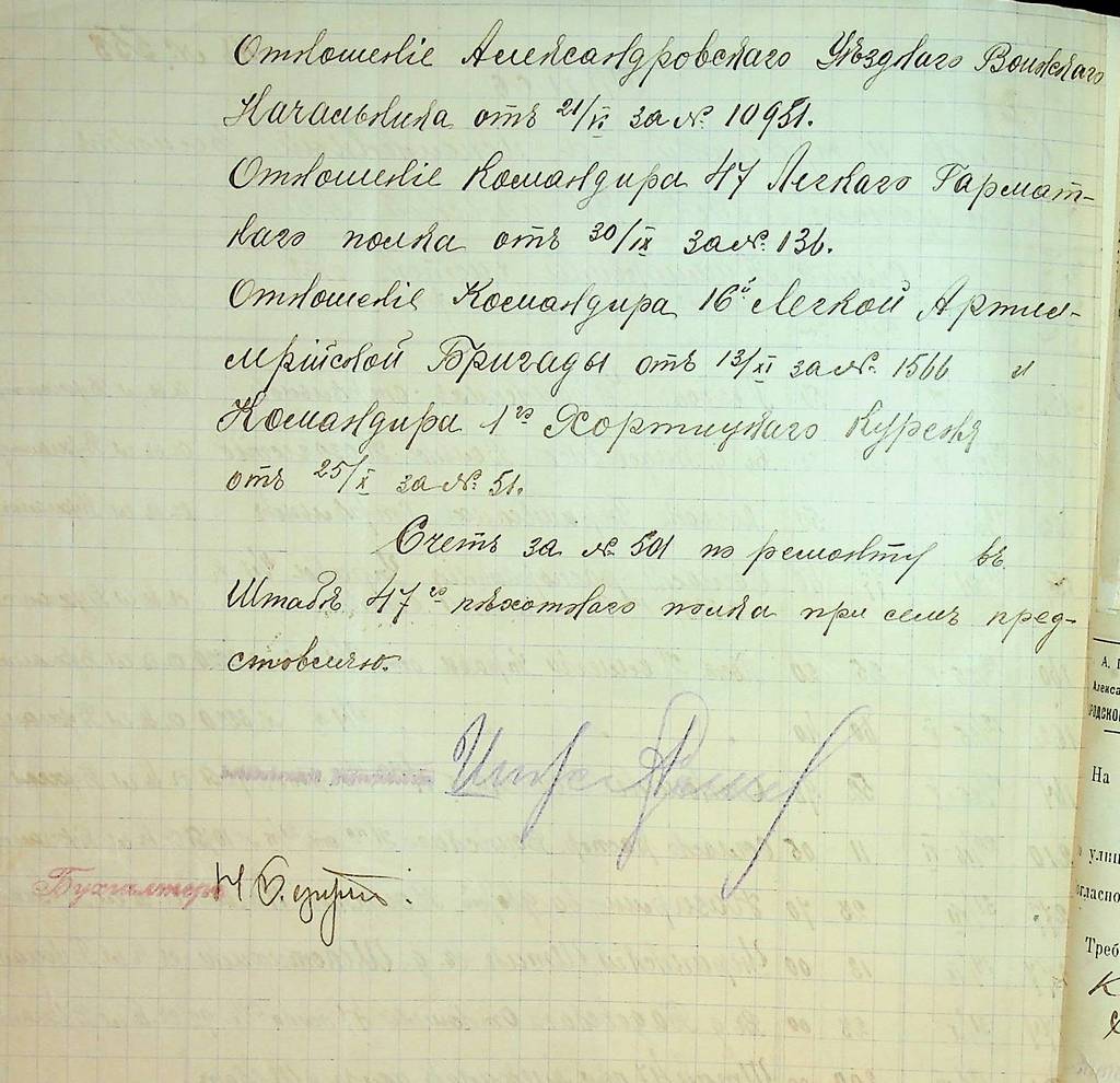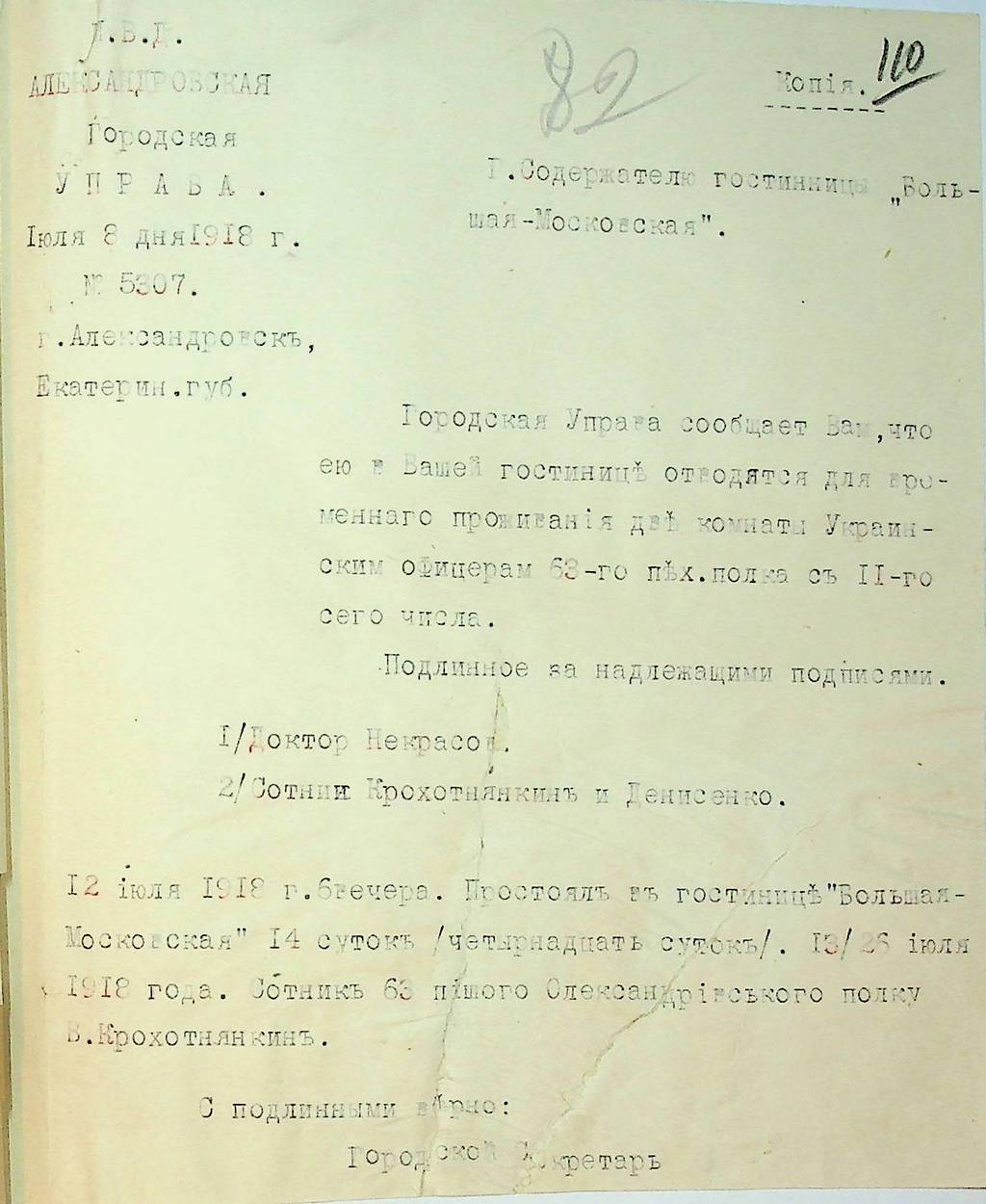 Лист-повідомлення Олександрівської Міської Управи до власника готелю «Велика-Московська» про тимчасове розміщення офіцерів 63-го пішого полку |