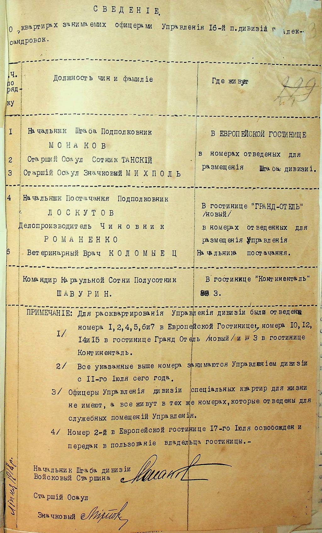 Відомості про квартири, які зайняті офіцерами Управління 16-ї пішої дивізії м. Олександрівськ |