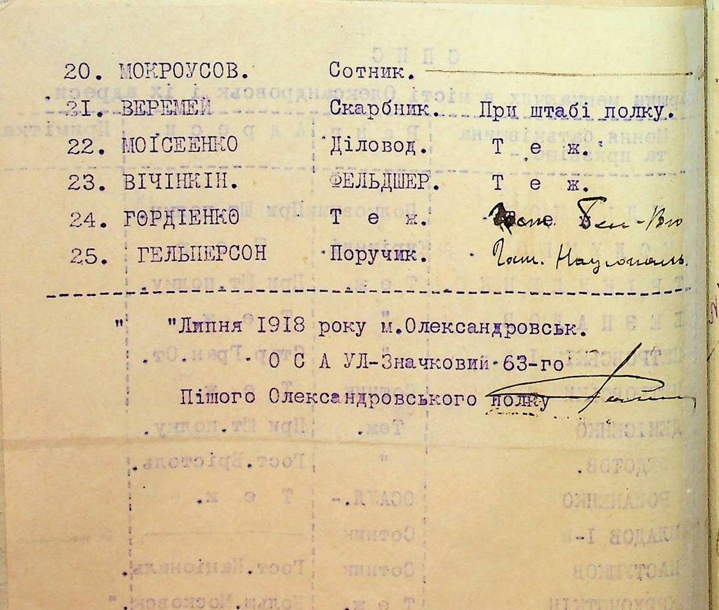 Спис старшин 63-го пішого Олександрівського полку, які мешкають в місті Олександрівськ і їх адреси |
