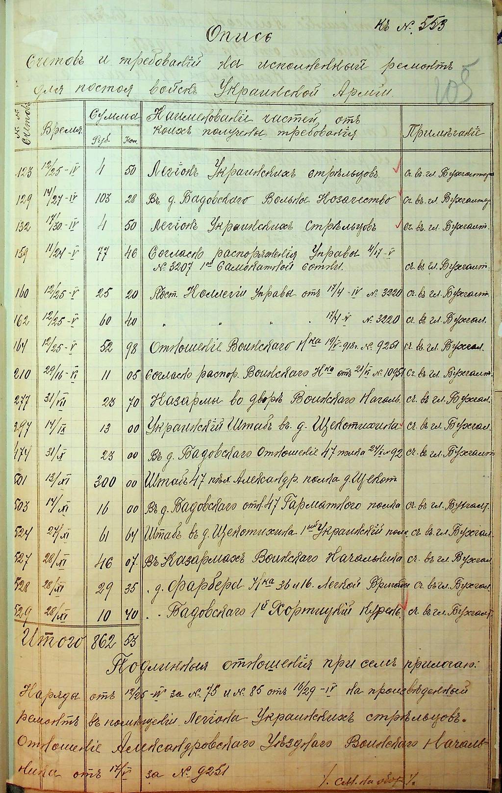 Опис рахунків і вимог на виконаний ремонт для постою військ Української Армії |
